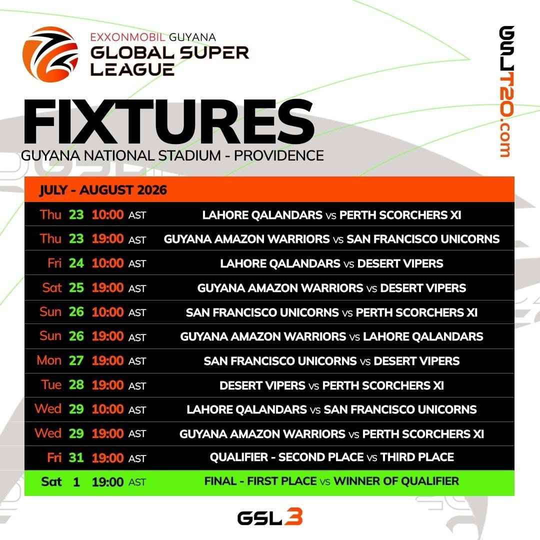 The ExxonMobil Guyana Global Super League (GSL) has officially unveiled the full match schedule for its highly anticipated 2026 edition, set to take place at the Guyana National Stadium, Providence, from July 23 to August 1, 2026.