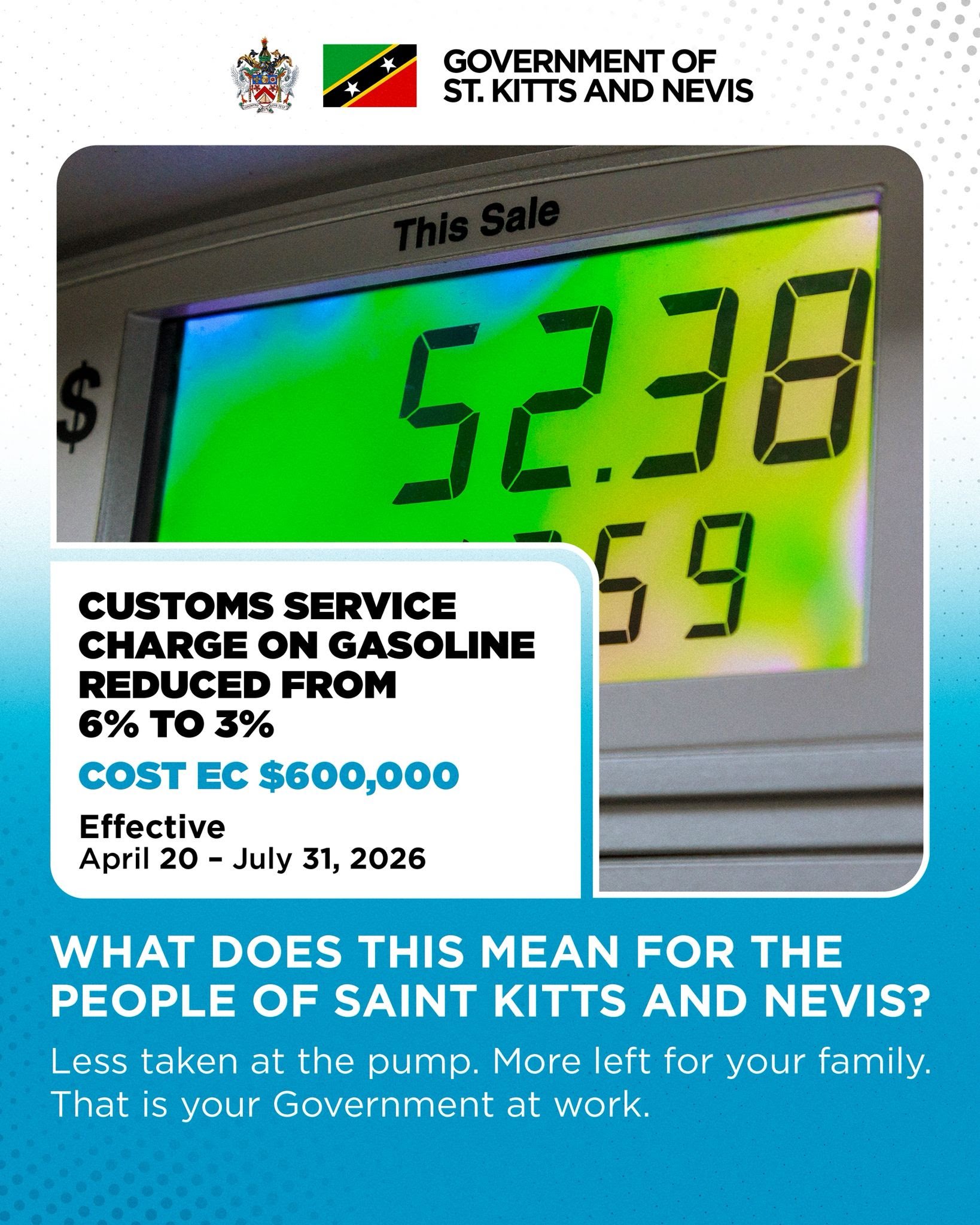 Additionally, the reduction in the Customs Service Charge (CSC) on gasoline from 6 percent to 3 percent – until July 31st, 2026, will also soon be reflected at the pump as future shipments of fuel arrive in St. Kitts and Nevis in the coming days and weeks.